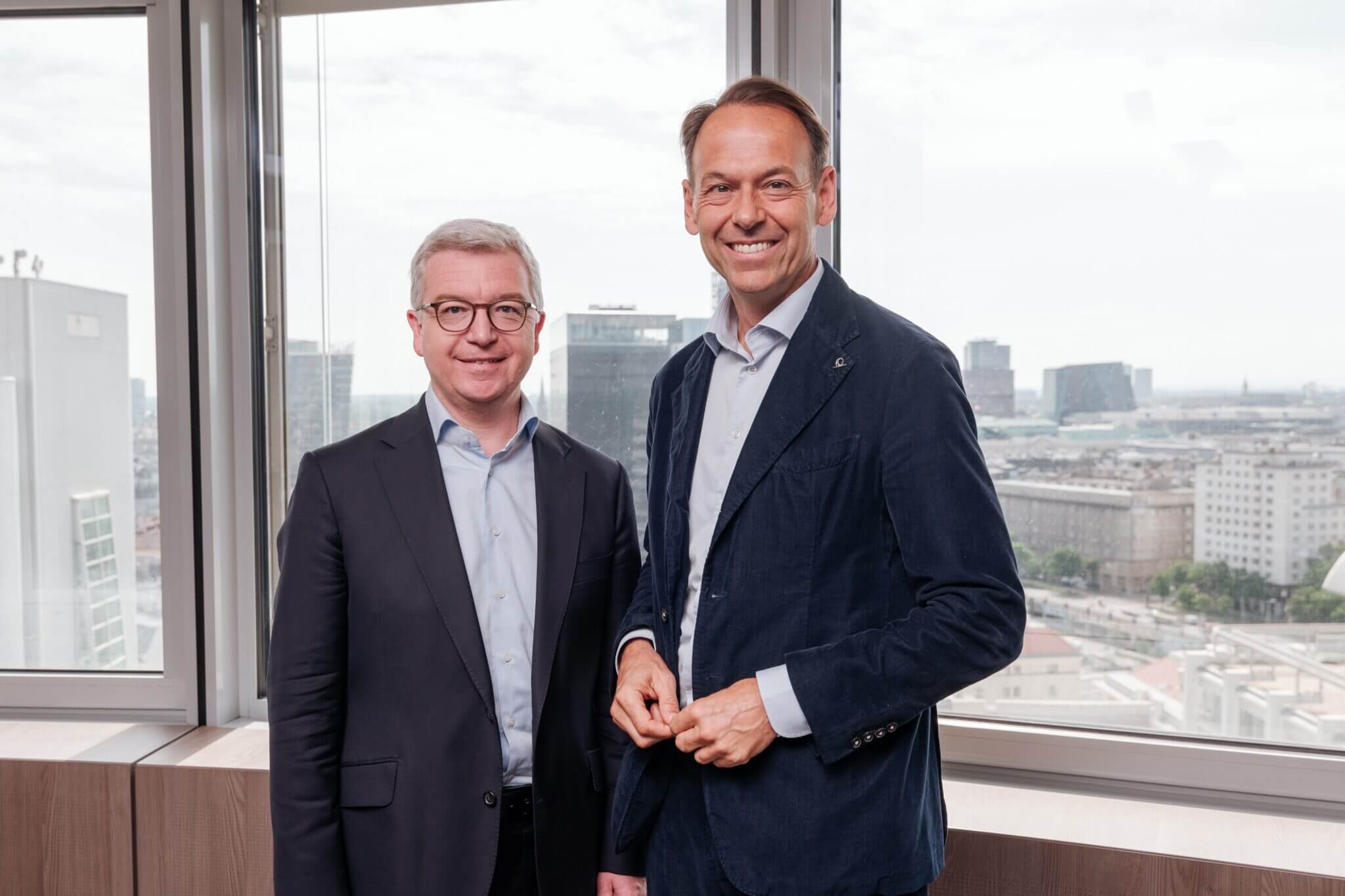 Pressefoto zum Download (Fotocredit: Niklas Stadler): v.l.n.r. Michael Höllerer, Generaldirektor Raiffeisen NÖ-Wien, und UNIQA-CEO Andreas Brandstetter